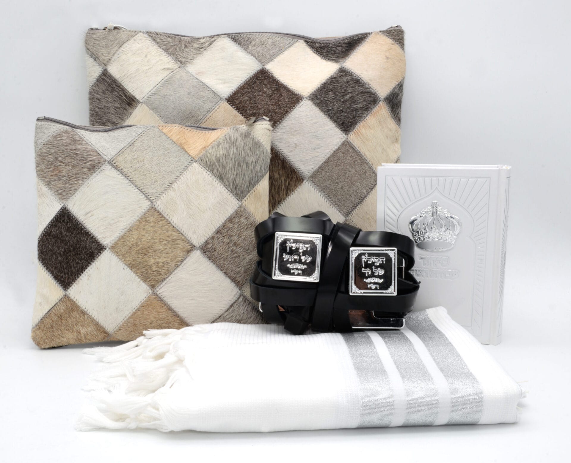 • כיסוי טלית תפילין עור אמיתי • עור פרווה מיוחד צורת מעויינים • המחיר כולל ריקמת השם.מתנה